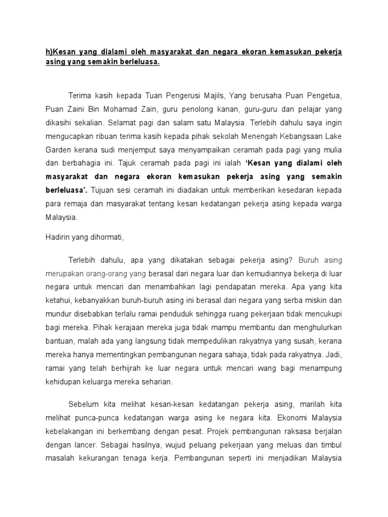 Contoh Karangan Kesan Kemasukan Pendatang Asing Ke MalaysiaBerikut dikongsikan contoh karangan Kesan Kemasukan Pendatang Asing Ke Malaysia yang memberikan kesan positif dan juga negatif. Langkah tersebut adalah bagi menarik kehadiran pelabur asing untuk melabur dalam bidang perindustrian perkilangan dan pembinaan di samping menyediakan. Sebelum ini sekuriti makanan dan pendidikan telah diberi perhatian.